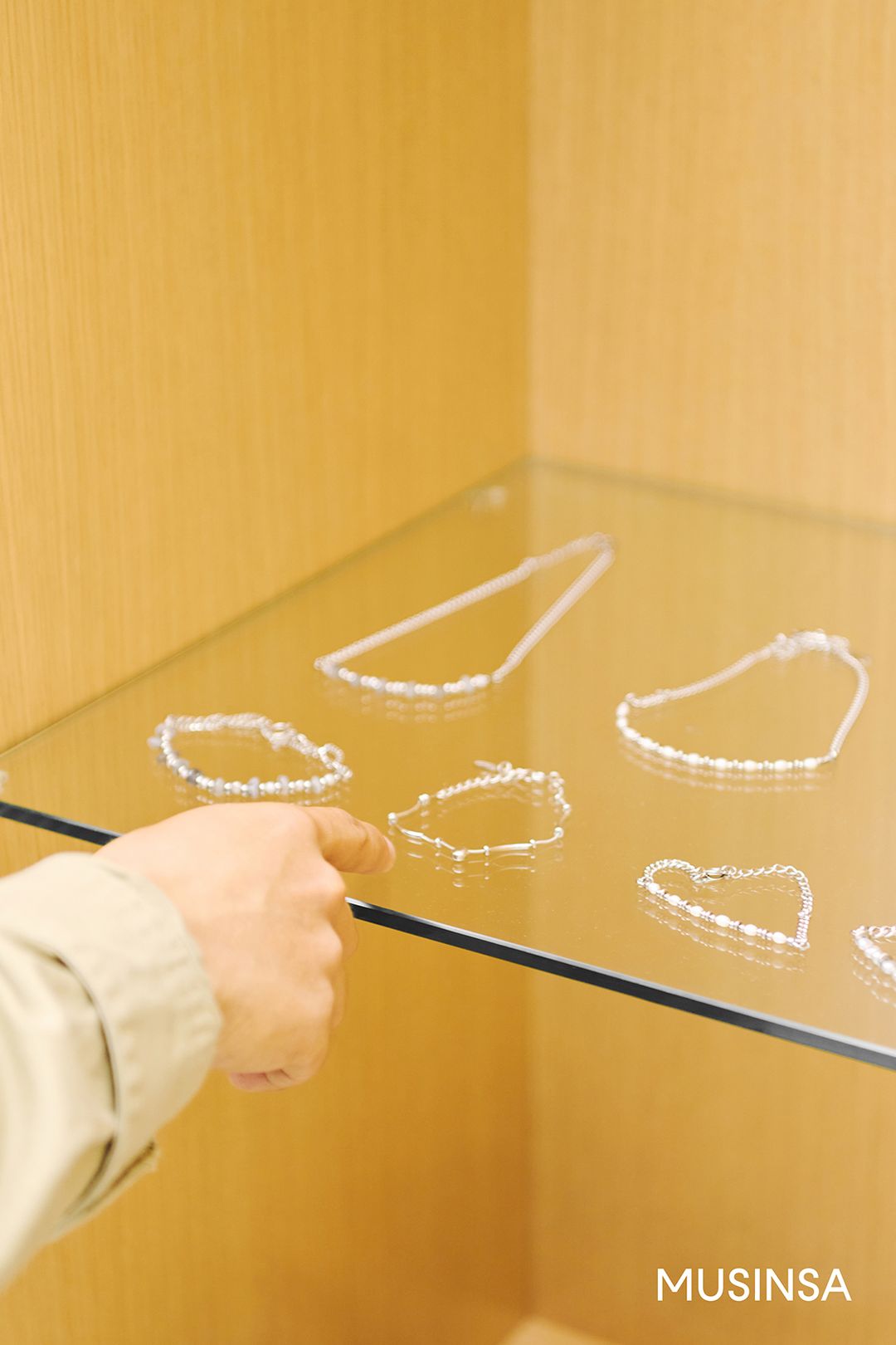입구를 지나 매장 안으로 들어서면 우드 소재 진열장이 가장 먼저 눈에 들어온다. 차가운 재질로 구성한 공간 한가운데 따뜻한 질감의 원목이 있어 자연스럽게 시선이 머문다. 이곳에는 여유로운 실루엣의 가방부터 포인트 액세서리까지, 각 제품을 마치 박물관의 예술품처럼 전시했다.