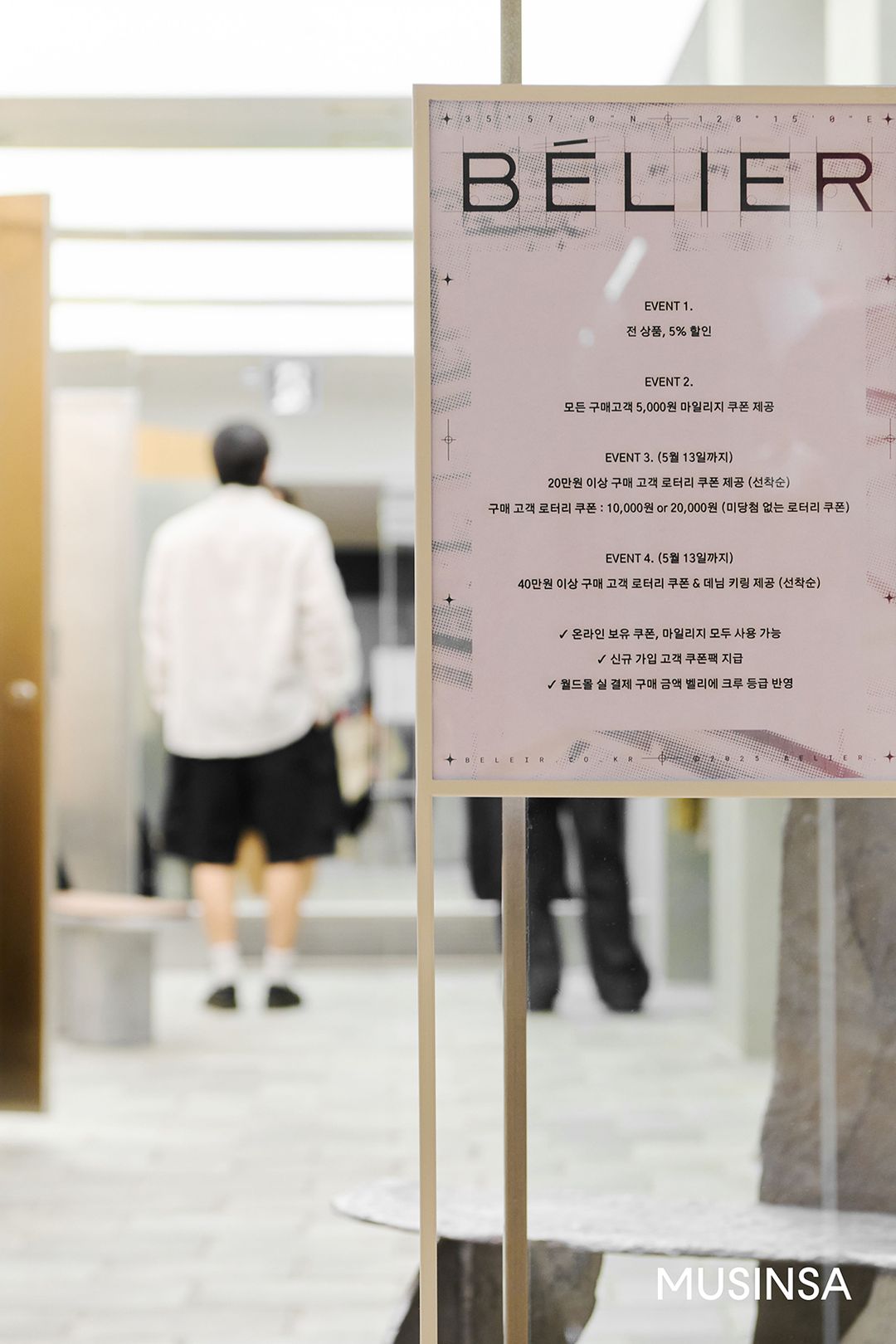 - 전상품 5% 할인 - 모든 구매 고객 대상 5,000원 마일리지 쿠폰 제공 - 20만원 이상 구매 시 로터리 쿠폰 증정 - 40만원 이상 구매 시 로터리 쿠폰과 데님 키링 증정 * 금액대별 이벤트는 5월 13일까지 선착순으로 진행한다. * 온라인 보유 쿠폰 및 마일리지 모두 사용 가능하며, 월드몰 실 결제 구매 금액은 벨리에 크루 등급에 반영된다.