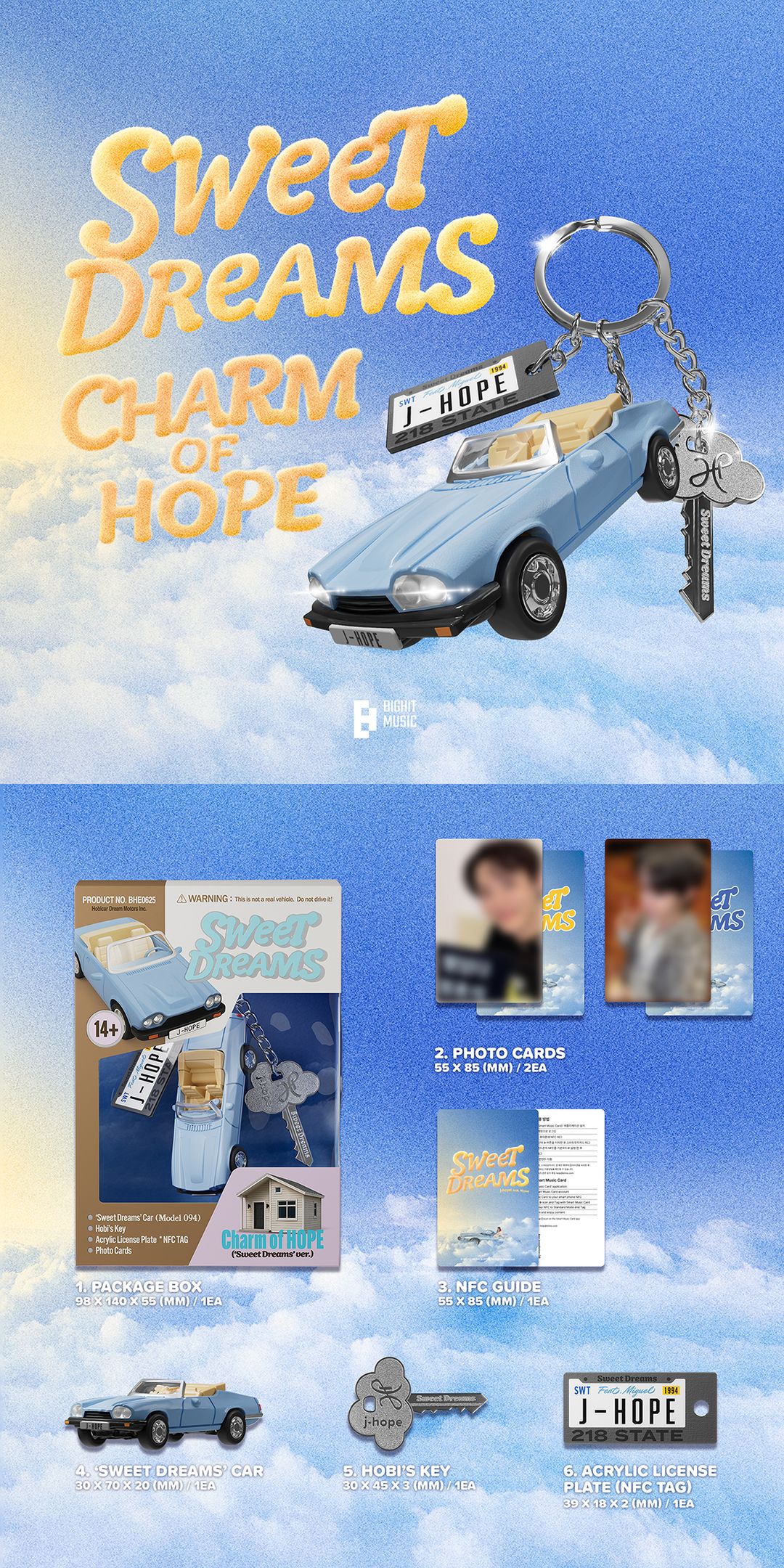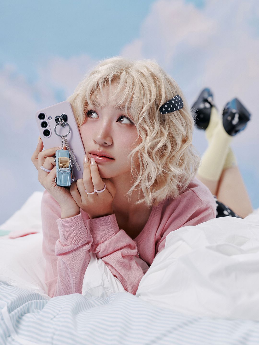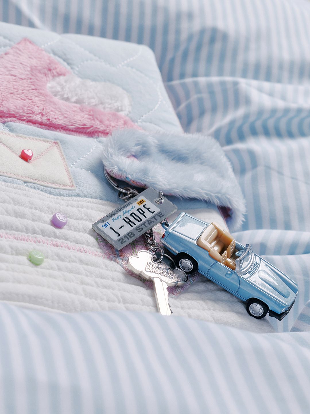 사랑에 빠진 설렘을 달콤한 꿈처럼 그려낸 R&B 곡에 맞춰, 동화 같은 무드의 러블리한 룩을 연출했습니다. 뮤직 비디오 속 구름 위를 나는 클래식 카를 모티프로 열쇠와 번호판까지 섬세하게 키링에 담았습니다.