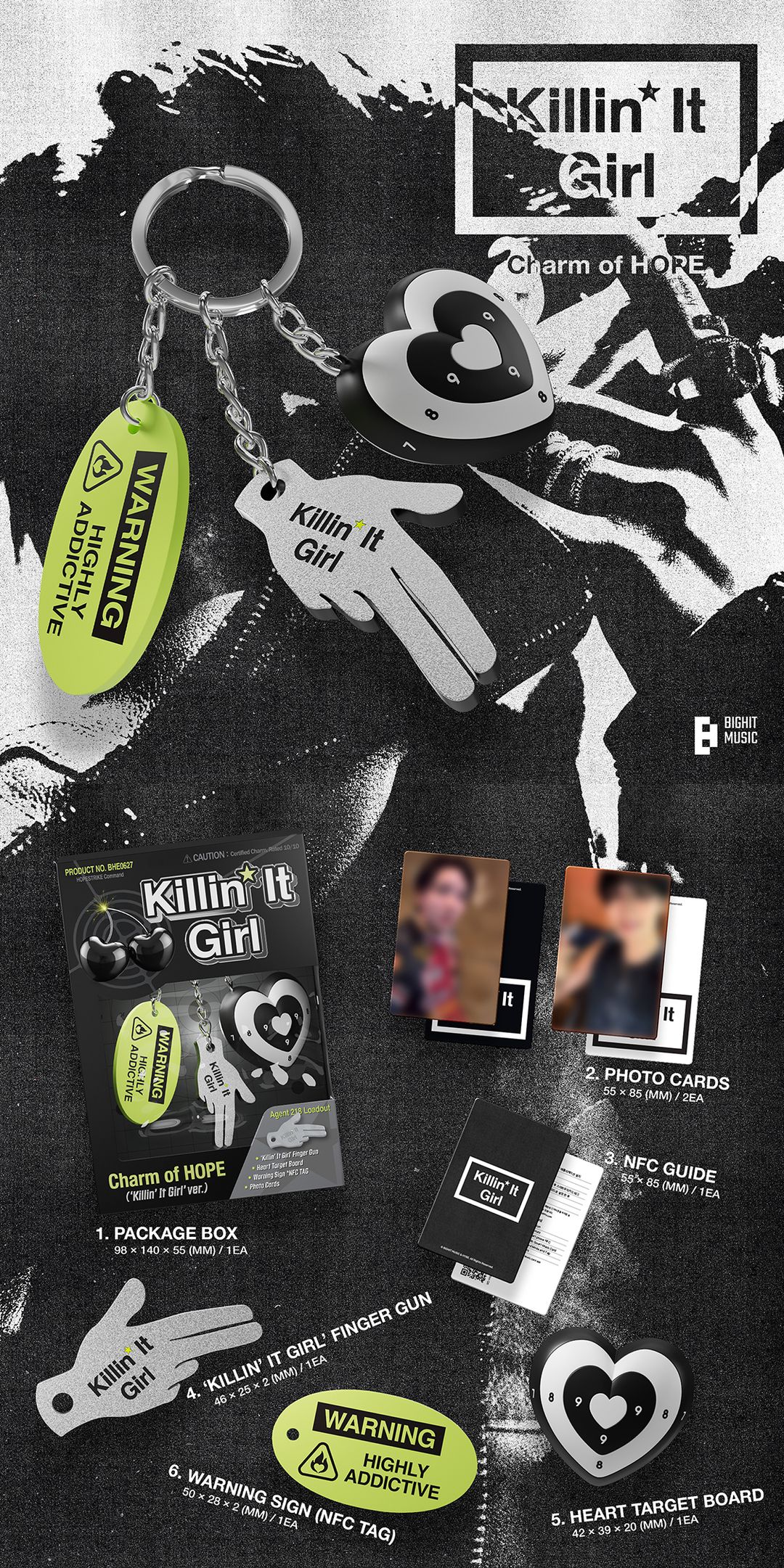 강렬한 끌림을 세련된 힙합 사운드로 풀어낸 곡입니다. 중독성을 경고하는 문구와 춤에서 착안한 손가락 총 제스처, 10점 만점의 매력을 상징하는 하트 과녁까지 키링으로 만나볼 수 있습니다. 관능적인 무드와 어울리는 시크하고 스트리트한 스타일을 표현했습니다.
