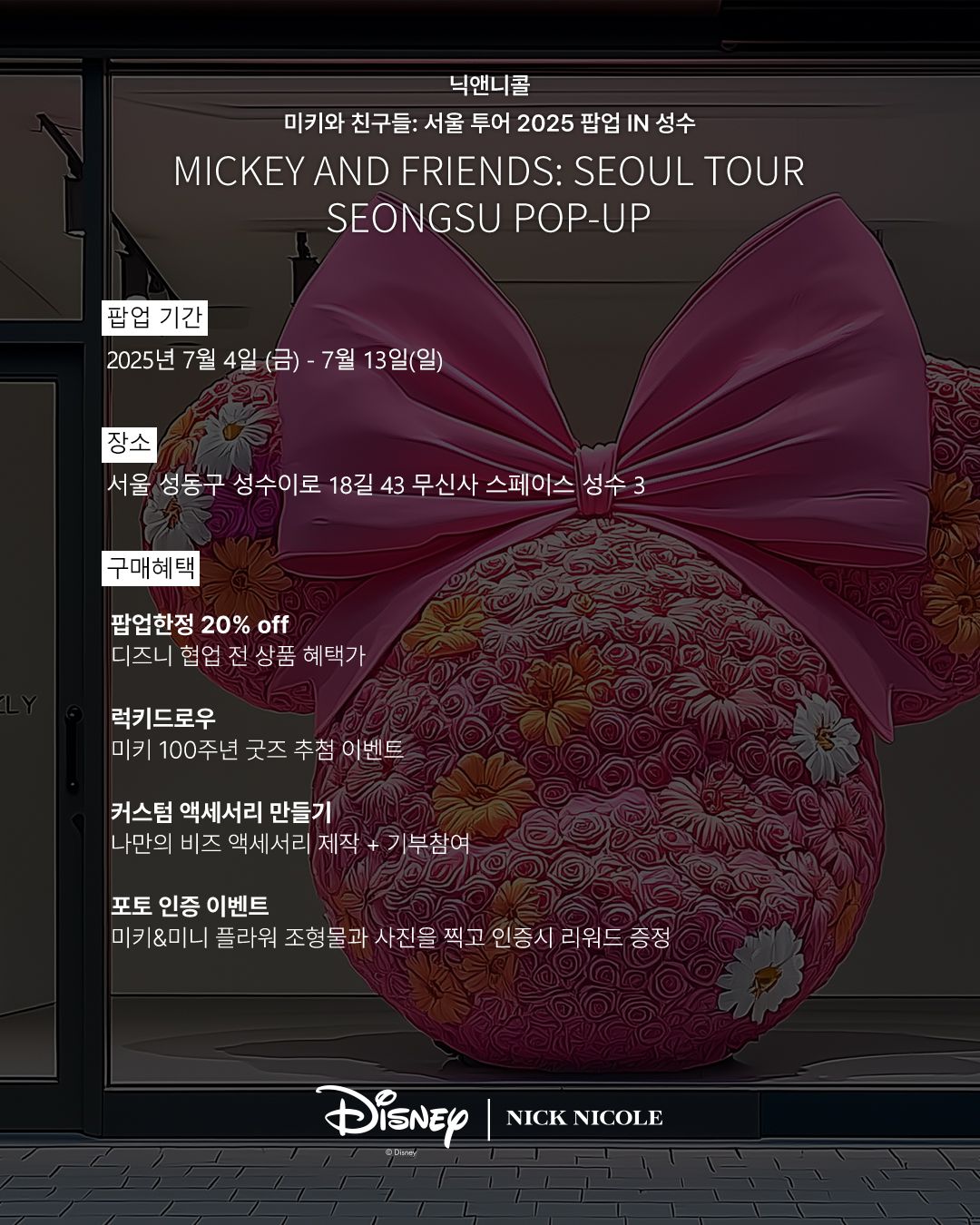 미니멀하고 웨어러블한 디자인을 전개하는 컨템포러리 브랜드 닉앤니콜 (NICK&NICOLE) 이 디즈니 코리아 (DISNEY KOREA) 가 전개하는 캠페인 ‘미키와 친구들: 서울투어 2025’와 함께 특별한 팝업 스토어를 오픈한다.